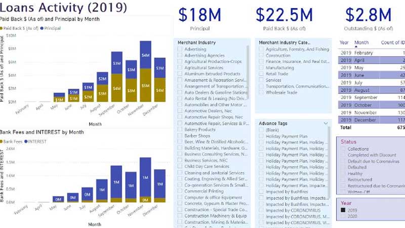 Fintech lender loan and fee activity tracking.