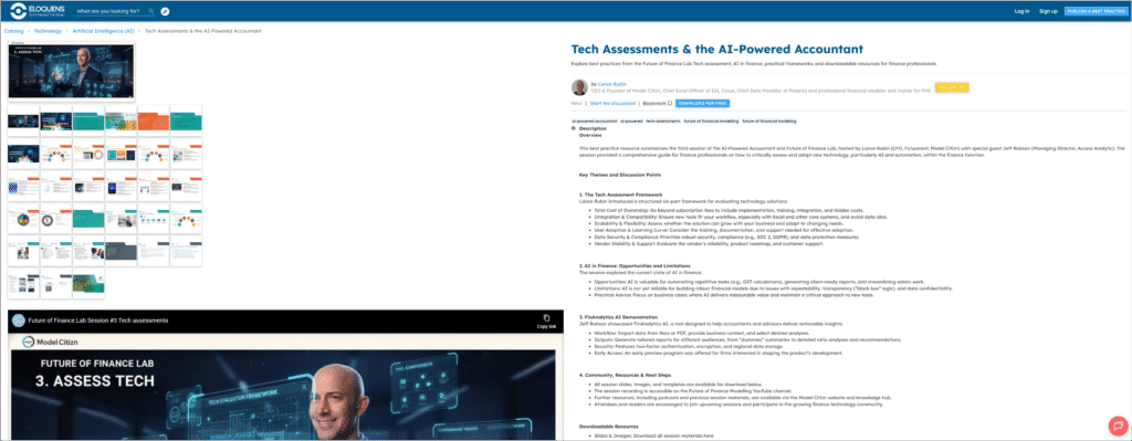 - Further resources—including podcasts, previous session materials, and modeling templates—are available through the Model Citizn website and knowledge hub under the Future of Finance Lab context.